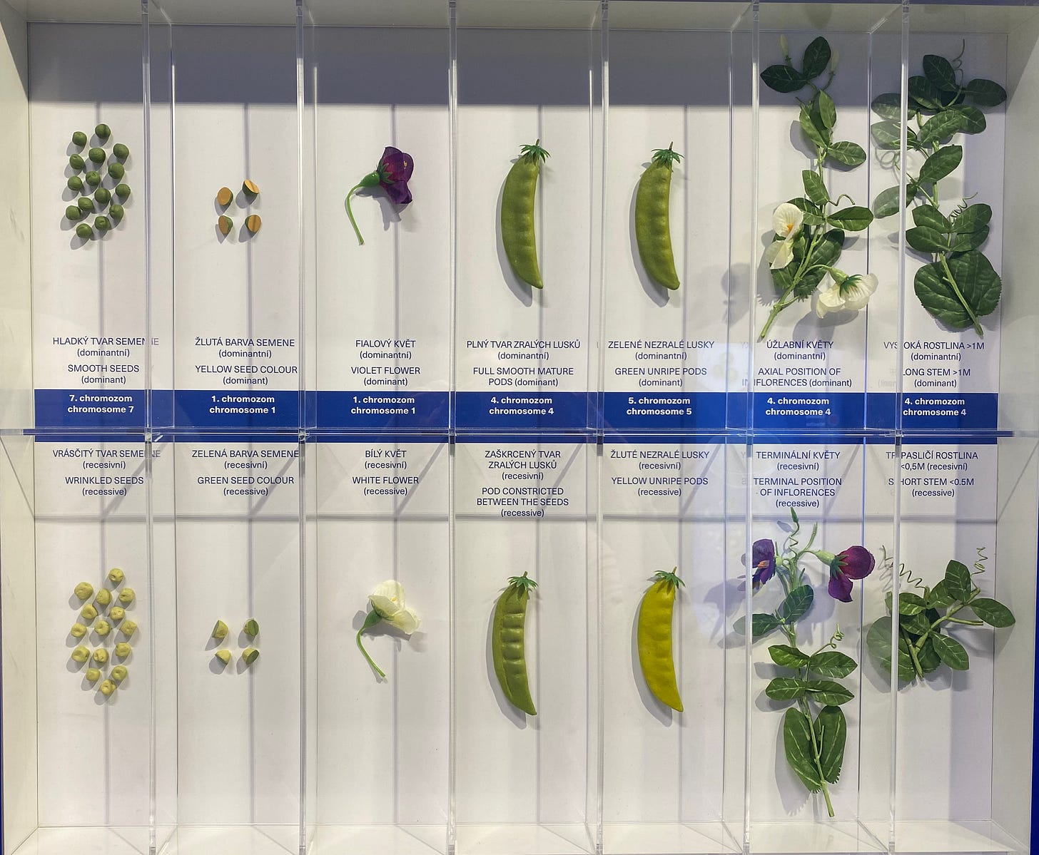 At a little interaction station in the museum, I sorted dried peas like the brothers of the Brno monastery did for Mendel for years. The basis of the famous experiment had to do with sorting pea seeds that were different combinations of wrinkly, round, green, and yellow. By cross-pollinating in different combinations, Mendel was able to see how the offspring of the cross-bred plants inherited different traits from the parent plants. Between 1856 and 1863 Mendel cultivated and tested some 28,000 plants at the monastery, and his fellow monks would help him sort according to the seven traits that Mendel was interested in: seed shape, flower color, seed coat tint, pod shape, unripe pod color, flower location, and plant height.